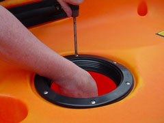 Put the hatch back together and screw down lid make sure that it still fits the hole. Now we start fixing to the deck. Remove the backing from the gasket if fitted and refit the hatch in position. Using the correct size drill bit, 5mm on my Ocean Kayak hatch, drill you first hole, push in the first screw, if you are using sealant instead of the gasket, screw on the nut and lightly tighten, now drill the opposite hole and push in the screw, drill and fix opposites until finished, then fully tighten all the nuts again doing opposites. I added a little sealant to each of my holes before inserting the screws, messy job but I don't want any leaks. Refit the bag and firmly screw down the cover.