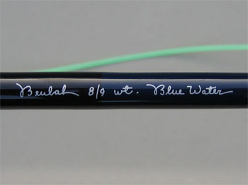 A quality blue corduroy tube with internal black cloth bag keep the Beulah's Blue Water 8/9 wt fly rod safe. Sliding the blank from the cloth bag reveals a beautiful gloss blue IM8 blank in three equal parts, eight oversize snake guides and two lined stripping guides are whipped with navy thread the stripping guides embellished with twin silver thread hoops, it's great to see the varnish has been applied with care, so often rods are ruined by sloppy varnish work. There is no hook keeper.