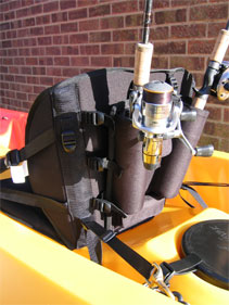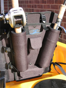 First up a rigid panel with two lined rod holders and two small accessory pockets with velcro flaps mounted to the back rest. The rod tubes are well designed and will accommodate both light spinning and heavier boat rod handles.