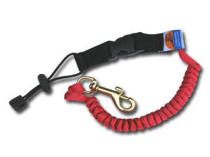 Adjustable bungee rod leash with quick release clip to disconnect rod from leash. Red elasticated strap and brass security clip.