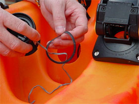 Place the supplied rubber gasket on to the compass body, feed the lighting wire through the hole in the hull first, followed by the threaded part of the compass body, this may be a tight fit, so twist/screw the compass into position.