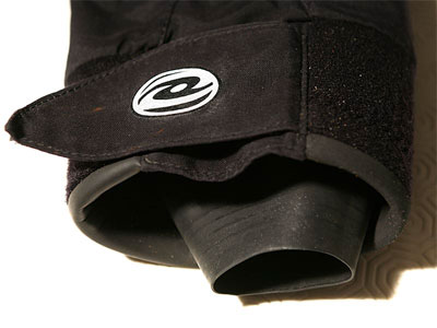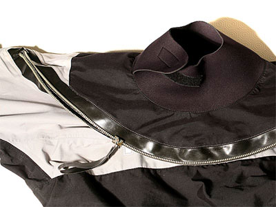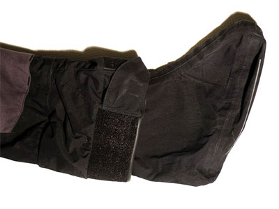 The flap idea is also used at the ankle to tighten the suit around the sewn-in fabric socks, taking up slack from them and from the bottom of the leg and again supplying an extra seal in case of leakage.