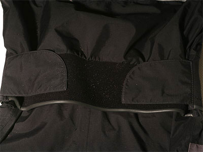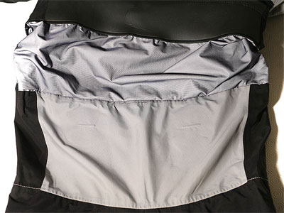 Inside the suit there are more features. The most prominent is a set of internal braces which can be hooked over your shoulders to hold the suit in place correctly, both when fastened up in use on the water and when walking around with the top down; saving the wearer from tying the arms around their waist. These attach to rings inside the suit – although I removed mine early on.