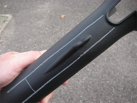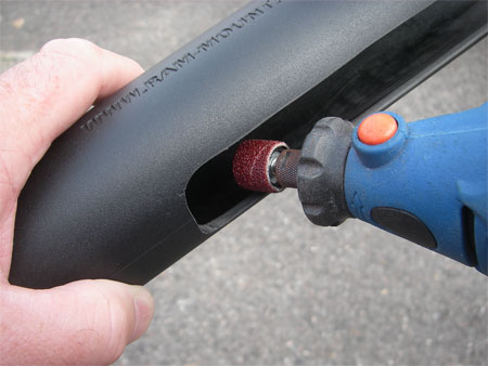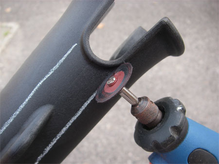 The idea was to deepen the reel grove on the composite RAP-119SW. I drew a line on either side of the tube, then a line joining the two about 8cm up from the base using a white chinagraph pencil. A Dremel with a little abrasive cutting disk was used to cut down both lines and across to cut out the waste, this was slightly problematic as the plastic gets so hot that it rewelds behind the disk so running through a couple times was necessary.
