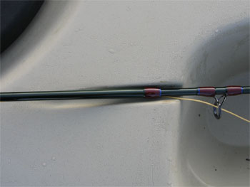 Towards the bow there is a short centre console which incorporates a cup holder and Scotty baitcaster/spinning rod holder. Either side of the centre console are a pair of moulded slots, these are designed to hold a rod blank when laid in the cockpit, a bungee cord forward of the day hatch keeps your rod secure, another simple but brilliant idea which has been shared with the Mad River Canoes Synergy 14.