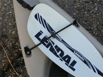 Topsides there is the standard WildernessSystems 18.5" bow hatch. Forward of the hatch is an elasticised rope stretched across the bow, centrally on the rope a small rubber wheel, combined they make a paddle keep which is a simple but very nice touch, the rubber wheel aids the blade under the rope… genius. There are also a pair of paddle straps either side of the cockpit, these are integrated with the cockpit handles.