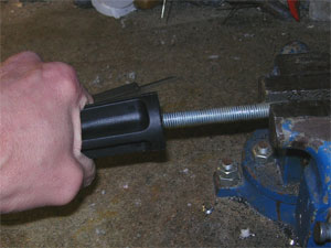 4. Place a pre cut 75mm length of 10mm galvanised stud bar in vice and wind on Scotty. This is quite tight and requires 2 hands.