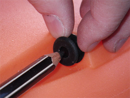 Easing the grommet into place.