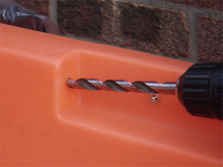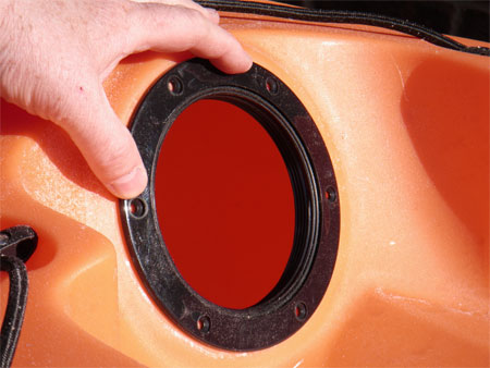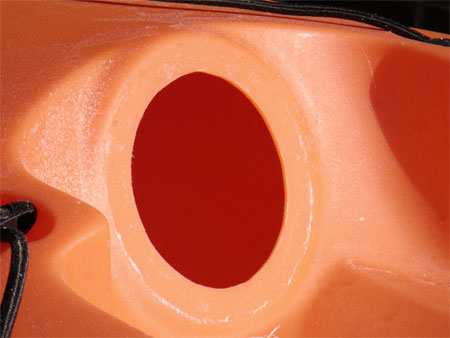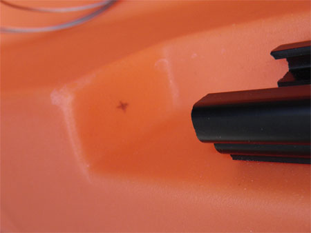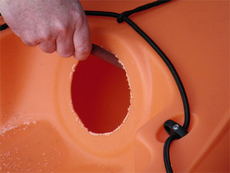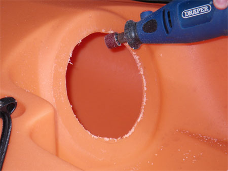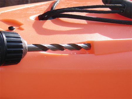 At the stern of the kayak there is a moulding on each side for the rudder control cables to exit. Measuring and marking the centre on each side, I then used a punch to mark centre so that the drill would not slip, there is little room for error when drilling here.