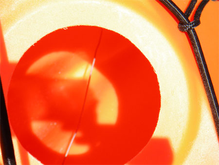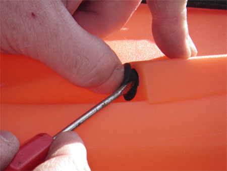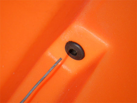 Cut the end of the black plastic tubing at an angle with a sharp point, this will make it easier to feed the pipe through the grommets. Smear a little washing up liquid onto the end of the pipe and feed the guiding wire into the plastic tube and start pushing the tube through the grommet, once the washing up liquid lubricates the inside of the grommet things get a little easier and the pipe will start to push through with ease, it makes things easier if you have an extra pair of hands to help with this stage. As the pipe gets to the rear of the kayak it will be easier to push through the rear grommet by hand. Once out, pull out the wire guide, pull the tubing tight and trim each end so that there is 2cm protruding at each end.