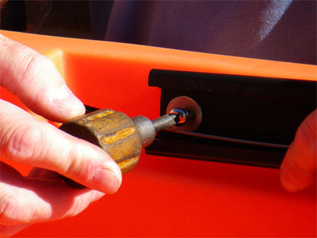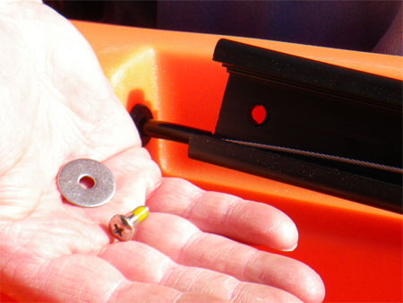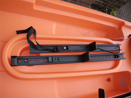 Time to move up to the cockpit and fit the foot controls. The Ocean Kayak Rudder Kit supplied fits several different models and for our T11 the fixing holes in the foot control track only aligned with the front brass insert, a nut and bolt are supplied to drill the kayak and fit using the hole in the track but we decided to drill the track to fit the brass insert towards the rear, it would have proven near impossible to fit a nut to the rear of a drilled hole without the Rod Pod cut out.
