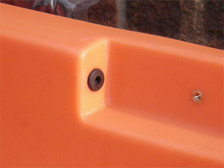 The rudder bracket with black plastic bolts still in place.