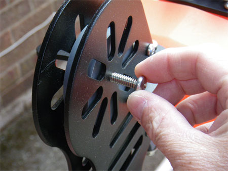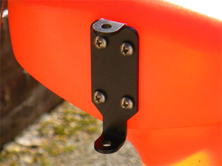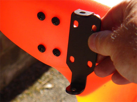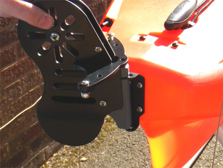Both fitted, I bolted on the rear bracket which the rudder bolts too, this is done by removing the 4 black bolts from the stern of the kayak and screwing the bracket back on using the supplied stainless steel fittings, the bracket needs to be fitted with the longer section pointing down, the four holes nearer the top, don’t tighten until all the bolts are fitted as you will need to ensure it is as close to square as possible or the rudder will not hang vertically.