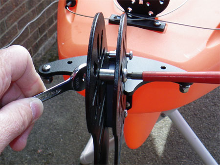 Once tight the steering head of the rudder can be placed into the bracket, ensuring that all the washers are placed in their right positions on the inside of the bracket to space the rudder correctly. There is no need to do the nyloc nut up just yet.