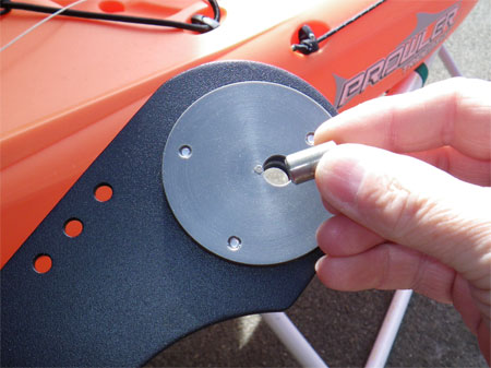 I then removed the bolt, nut and spacer from the top of the steering head. The spacer was then placed in the hole on the rudder blade as shown in the photograph. When fitting the blade to the steering head, the cut out shape and holes face to the rear away from the stern of the kayak when the rudder blade is in the down position. The blade was slipped back into the steering head the spacer, now in the rudder blade was aligned with the original hole and the bolt and nylon nut used to hold in place.