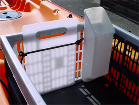 First thing I needed to do was add storage for the anchor, stopping it from sliding around but with easy access. Whilst looking around the chandlers, I came across a white plastic anchor holder, designed to hold a 1.5kg/3lb folding anchor, made by TREM of Italy, product code N 62 00 500, perfect. It was supplied with the necessary bracket and bolts, so all that was needed was to drill 2 holes slightly lower than the existing ones in the holder and file the holes in the crate to accommodate the bolts. Fitting the holder to the inside corner of one of the ends still allowed the crate to fold.