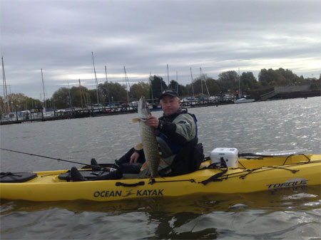 Dropping into the Ocean Kayak Comfort seat I headed out between the moored broad boats and out onto the broad, the motor runs quietly unless provoked by a quick twist into full reverse, do this and a racket prevails from the Minn Kota’s Weedless Wedge Prop and then it’s back to smooth running; I was on my way, a push on the port peddle and the Torque responded well, guiding me out towards a pair of house boats, there are always pike around this area so I dropped my new favourite lure a Savage Gear 4Play in Blue Silver over the side and dropped my speed to around 2mph, almost immediately I was into a fish, I steered to port to bring me broadside to the Pike and killed the motor. A brief struggle pursued then my quarry was along side a 4lb pike double hooked in the chin so I had to grab behind its head, not the most dignified way to pick up a pike, but I didn’t fancy getting hooked up myself.