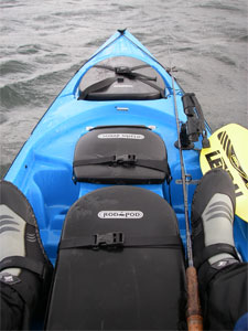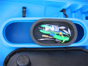 The Rod Pod is a dominant feature in the cockpit, a pair of straps keep the tight fitting lid (with built in cup holder) secure, opened you are given access to the hull and a sliding tackle tray, although swamping is unlikely given the Rod Pod's raised profile in the cockpit, it would however be wise to give a little thought to when you open it. Keeping all your essentials in the tackle tray negates the need to reach into the tank well an action that can occasionally mean taking an early dip, if you lack good balance.