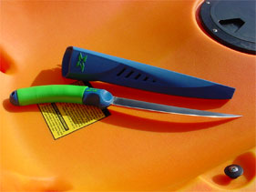 The soft green non-slip handle is very comfortable in the hand and the flexible, but extremely sharp hollow ground blade makes filleting easy. The blade is a little long for preparing baits on the kayak, the 6" version would probably be less daunting, but on shore when cleaning and preparing your catch the longer blade comes into it's own.